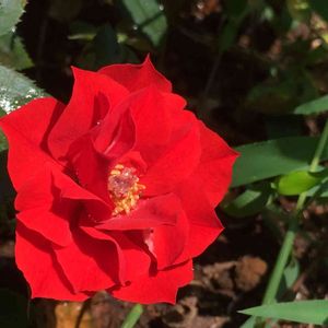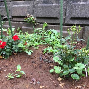 🌿🌹ミニ薔薇さん🌹🌿 地植えにしたら、お花が大きくなって色が 赤❤️からオレンジ風🧡になっちゃいました 姿の見えなかったギボウシ💚さんの近くに 植えたみたいで、お邪魔してま〜す🤭