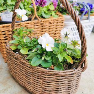 ノーブランドの白ビオラ 挿し芽と切り戻した親株のバスケット寄せです 咲き始めました