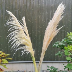 今年もパンパスグラス始まりましたね よく行く花屋では生花のパンパスも売ってるので、自分でドライフラワーに仕上げます 左が生花で右が干して10日位のドライフラワー 風にあてて時々モミモミしてほぐすとふわふわになるんだよね