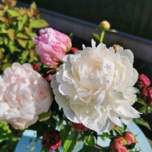 玄関に飾った芍薬 ガラス窓から朝の優しい光が差し込んでとても綺麗でした