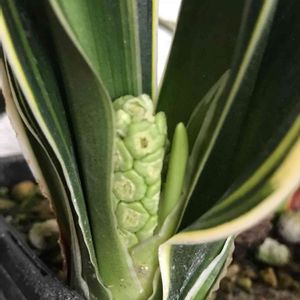 植え替えもせず室内に置きっぱだったのに、ちゃんと季節を感じて花芽を出してくれたオモトです。 葉の縁には白い斑が入ってます。