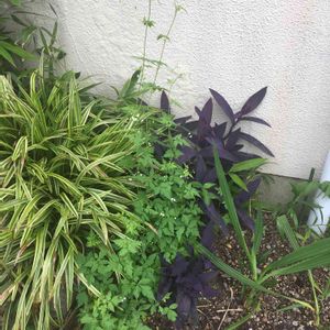 職場の花壇🌿 零れ種から芽吹いた🌱フウセンカズラの蔓がニョキニョキ😄 グリーンはカレックス?と思ったけど、和物かなあ🇯🇵