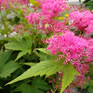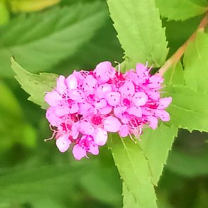 シモツケソウ(下野草)バラ科シモツケソウ属 昨日は想像以上に涼しく、10時半なのに長袖必要でした。 しし岩付近には濃いピンクのシモツケソウがたくさん咲いていて綺麗でした。 中部以西の本州、四国及び九州に分布するバラ科の多年草。 落葉樹のシモツケに似た花を咲かせる草であることから、シモツケソウと名付けられました。 花は5㎜程の小花で、よく見ると3~5枚の花弁があり、花弁よりも長く薄紅色の花糸を伸ばしたおしべが20~40本、花の中央にめしべの花柱が4~5個見られます。 葉は、掌状に5~7裂し先が鋭く尖り縁に不揃いの鋸歯があるのが特徴です。 🏷 19日はピンクの日 🏷 oriの自由なピンクの日