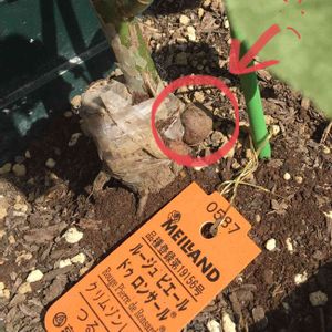 先日見つけてしまった「コブ」 何度も見たこの姿 「癌腫 」です😱 癌腫病に感染すると根や株元ににコブができ、それが次第に大きくなって、株全体が衰弱したり枯れてしまうことがあります しかもこの薔薇 春にお迎えしたばかりの「新苗」 河本バラ園の去年の新品種『ル・ソワール 』 せっせと摘蕾し、肥料をやって、薬をまいて、すくすく育って、 秋の開花をすごくすごく楽しみにしていただけに、めちゃくちゃショックでした 育てて半年で出来たのは、最短記録です 「カルス」かも?と、現実逃避してみたものの、毎年癌腫と向き合っている私は、もう100%癌腫にしか見えなくて・・・ さすがに半年なので、販売元に問い合わせをしました とても丁寧に対応をしてくださり、メーカーへも確認、やはり「癌腫病 」との回答でした 現在新苗の取り扱いがないため、冬に6号大苗を補償として送ってくださることになりました バラ栽培を始めて9年目ですが、新苗を育てたのは今年が初めて 小さい苗から大きくなる様子をずっと見ていたので、いつも以上に愛着がわいていたル・ソワール 残念ではありますが、出荷の時点で癌腫を見つけるのは困難ですし、 生産者さんも癌腫を出さないよう色々苦労されていると聞きますし、 仕方のないことなのかな?と思います で、他の株も心配になって今日の夕方パトロールしたら、見つけてしまった‼️ 3月に届いた予約大苗『亜欧 』にも癌腫が〜〜💦💦 これに至っては、なるほどなという感じ お迎えした時から枝が細くて頼りなかったので・・・ こちらも販売元に問い合わせをし、返信待ちです 本当に厄介な病気ですね💦 様々な癌腫を見てきましたが、株元にモコモコっとできるタイプの癌腫が一番、株に負担をかけます 根っこにできた時は取り除いたあと、毎年元気にモリモリ育っている株がほとんどです 癌腫株との共存は非常に労力と手間がかかります ハサミの消毒はもちろん必須 土替えの時にも、土が飛び散らないよう気をつけたり、終わった後の土の処理、現場の消毒など、大変なことばかり 共存はなかなか難しい💦 色々考えてしまいます・・・ また冬に時間があるときにでも、癌腫について語れたらと思います😅