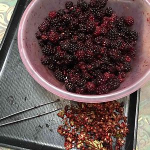 先週土曜にも沢山採り残りを今週土曜に採ったのがラズベリーとブラックベリー これで先週の1/3ほど、甘酸っぱくて美味しいが、白くて硬く小さなタネが口に残ってイヤな感じ、ミキサーで軽く潰して、それで100%りんごジュースやハーブティを少し入れたらタネは下に沈むので分離出来 毎食後美味しく呑んでいます