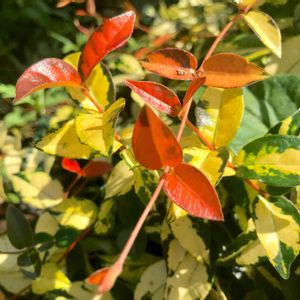 💛テイカカズラ黄金錦💛 親戚の家に初めて見る綺麗な葉っぱがありました。 濃い緑に黄色い斑が幅広く入り、新芽がオレンジ色ではっきりとしたトリカラーがとっても綺麗✨ 秋冬の紅葉も見事でグランドカバーや寄せ植え、ハンギングにもおすすめのようです。 夏に白い小さな香りの良い花を咲かせるようで、違う季節にも会いに来ようっと🥰
