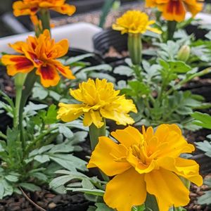 フレンチマリーゴールド 種まきっ子さん🌱✨ いろんな花色、花柄 可愛らしく咲いています☺️ 種まきの時期が長いのが特徴 温度があれば…発芽は容易⤴ 栽培のポイントは保水排水のよい土壌を好むので、腐葉土やピートモスを上手に利用することのようです(*^^*)🍀✨
