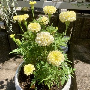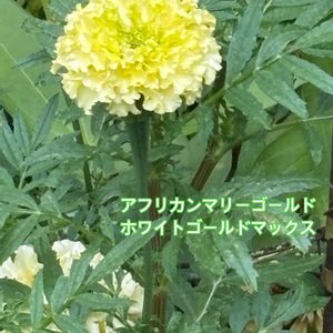 万寿菊(アフリカンマリーゴールド) ホワイトゴールドマックス miwaさんの投稿で知った万寿菊という名前のアフリカンマリーゴールドです。 ネットで購入したマリーゴールド(ラベルにはホワイトゴールドマックスと名前)は、普通のマリーゴールドより花も丈も大きく、ホワイトゴールドの色合(私はライムグリーンに見える)が素敵✨ 3枚目 蕾も大きい😳 2枚目、4枚目 花色は、咲き進むと、乳白色になります、 5枚目 普通のマリーゴールドとアフリカンマリーゴールドの大きさの比較です。 5月の連休に購入した普通の花が咲いてないマリーゴールドが手前下の方にあります。 暑い時期、30度を超えると花が咲いてないのですが、株の大きさが違いますね。 バラ、グリーンアイスも咲いてます😍 マリーゴールドには、 ①春先から咲いて小さく横に広がるフレンチタイプ(孔雀草) ②大きく丸くふんわりとした花が特徴のアフリカンタイプ(万寿菊) ③一重の花びらとハート型が特徴のメキシカンタイプ(ミントマリーゴールド) などがあるようです。 コンパニオンプランツとして数年前にフレンチマリーゴールドをたくさん植えてましたが、横に株が広がり過ぎたのでやめました。 特徴を踏まえて、マリーゴールドを来年はもう少し増やして植えてみようかな😌