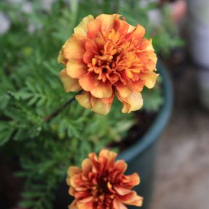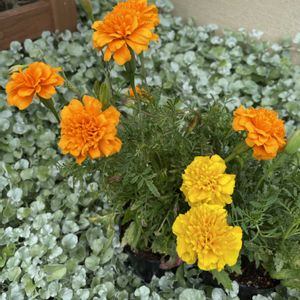 フレンチマリーゴールド𓂃 𓈒𓏸◌ ファイヤーボール 種から育てた苗で作った シンプルな寄せ植え 合わせた グランドカバープランツは ・グレコマ ヴァリエガータ ・リシマキア ミッドナイトサン この2種を鉢周りに足しただけ♪ シンプルが私の好み😊💕