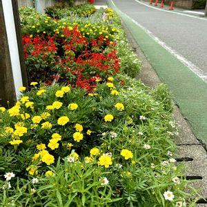 マリーゴールドがやっと咲きました ①②アフリカンマリーゴールド 8号鉢 4月購入苗、ハダニが酷くてボロボロだったけど毎日強めの葉水したら復活して花数が増えてきた😃 ③花壇植えの株、アンゲロニアに押され気味 ④⑤フレンチマリーゴールド 7号鉢 株は育つがなかなか蕾がつない😢 ホップに色変わりて書いてあったが普通の黄色じゃないかな〜?