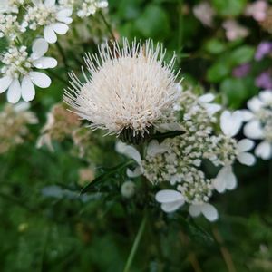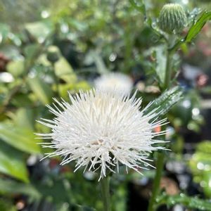 今日の花 アザミ 我が家の斑入りアザミは葉っぱだけスクスクと成長中 白アザミは種になりました〜こぼれ種でふえるかのかな?