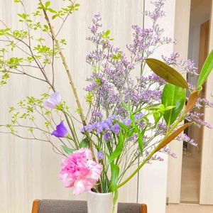 今のうちの一番大きな花瓶です。 紫はスターチスの一種だと思いますが、とっても良い香りがして、前にいるだけで癒されています…💕 ピンクのスターチスは、白い花が咲いてきてとってもキュート❣️ ドウダンツツジはこれからが本番なのでしょうが、新芽がとても美しいです。
