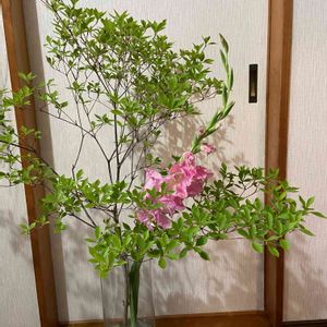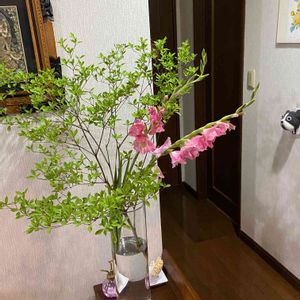昨日は、グラジオラス1本でしたが、 今朝はドウダンつつじの、キャンパスに、ピンクの、グラジオラスが、ひと咲き、仲間入りしてました。