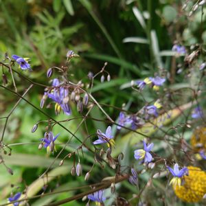 ディアネラ(キキョウラン) 水色の常緑葉がワイルドカッコいいけど、花はカワイイ紫💜(小さめでなかなか上手く撮れない)