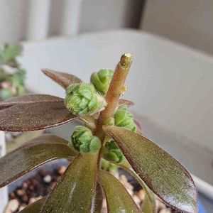 サンデルシー。 1つの鉢に2本。 1本は下の方でカット✂️して、新芽さん。 もぅ1本の方は、少し上の方でカット✂️したんだけど…… また、花芽?新芽もある? それとも、全部花芽? 🤷♀️