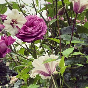 クレマチス プリンセスケイトさん💕 プラムパーフェクトさんと💗 プラムパーフさんに絡んでいたものね😉 家で奇跡的なコラボ。雨じゃなかったら良かったね😊 写真撮ったら切っちゃったもんね😢そしてプラムパーフェクトさん、沢山切ったけど、まだ蕾沢山あるのでまだ楽しめますね🌹