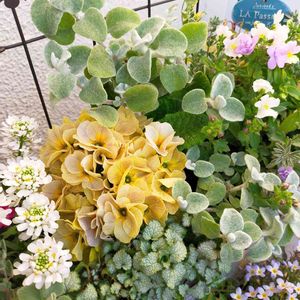 3月6日アップしたオステオスペルマムのハンギングがひと回り大きくなり満開です🌸 右上トップに隙間埋めで入れた ルピナス ピクシーデライトの花が咲き形もまとまり丸くなりました🍀*゜