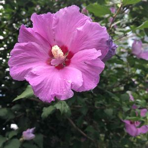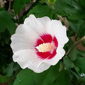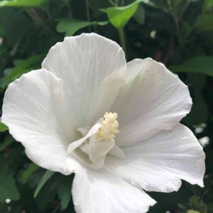 白いムクゲ🎶 アオイ科フヨウ属 大型の落葉樹 葉は卵形から卵状菱形、3浅裂し、粗い鋸歯がある 夏から秋にかけて、白やピンク色の、ハイビスカス🌺に似た美しい花が咲く 5花弁がやや重なって並び、雄しべは多数つき、雌しべの花柱は長く突き出る 朝花が開き、夕方にはしぼんでしまうものもあるが、そのまま翌日も開花し続ける場合もある