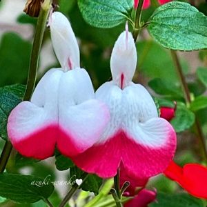 チェリーセージ・ホットリップス(学名: Salvia microphylla 英名: Cherry sage)の花🌺🌿🌸 チェリーセージは、メキシコに分布する多年草の観賞用ハーブです。 サルビア・ミクロフィラをはじめ、近縁種のサルビア・ヤメンシス、サルビア・グレッギーなど数種を総じてチェリーセージと呼ばれます。 ホットリップスは、気温や季節により花色が様々に変化します。 ほとんどの時期は、白と赤のツートンカラーでとても美しい花です。 涼しいと赤白の二色となり、暑いと赤一色になることが多いです。 とっても可愛らしくて素敵な紅白のチェリーセージの花をお楽しみください。 🌺🌿🌸