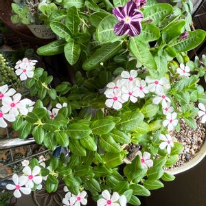 1️⃣ ニチニチソウ『藍染め絞り』 素敵な絞りの子が咲いていました😍 直射日光下で撮ると赤っぽい(↓) 2️⃣ 株元を見るとビックリ👀 こぼれ種でたくさん芽が出ていました🌱🌱🌱 (↙︎)種さやが落ちていたので、種がこぼれたのでしょう♪ よく見ると種さやがたくさんついています。藍染めさんは種が出来やすい品種のようですね😊 3️⃣ 今年こぼれ種で咲いた『いちごちゃん』の株元に、こぼれ種の芽🌱 でも『いちごちゃん』はまだ種が出来ていないので、多分お隣の藍染めさんから飛んできた種が発芽したのかと😅 『藍染め絞り』繁殖力旺盛⁉️