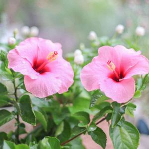 おはようございます。 今日はダブルで! ピンクのハイビスカスさん。 後ろの白いコは ビンカのMIKIさんです。 今朝は水やりが終わった瞬間 突然、大粒の雨が… 予報にはなかったよ〜 でも、よい1日になりますように。
