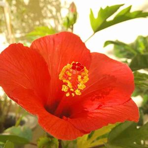 おはようございます🤗 日曜日に購入したハイビスカス 1鉢開花しました。✌️ もう1つの方は 付いてた蕾が落ちてしまい 心配しております。😓