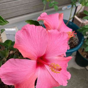 雨の中、とてもキラキラしたお花を見せてくれているハイビスカス です🌸💕冬越しして、我が家で一番最初に咲いてくれました♪ 2ヶ月以上前から蕾をあたため、外に出してからは葉を落としたりしたので、ちゃんと咲くか心配しましたが、とっても綺麗なお花💕秋の開花のように、濃いピンク色でうっすらとラメをまぶしたようにキラキラしています✨ 頑張ったね!と言ってあげたい😊