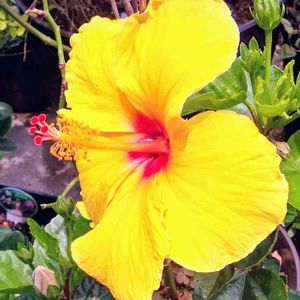 冬越しのハイビスカス🌺 やっと咲きました〰️💗 家の中に置けないので 納屋の中で休眠させてました。 8鉢中6鉢冬越しできたようです🤗💕 2鉢はカラカラに水を切りすぎたようでした😭
