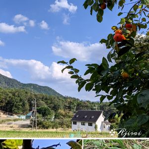 「青空 見上げる柿の木」 山里のお気に入り(Cafe Restaurant) 庭に実る柿 周りに広がる田畑 真っ青な空を見上げる様に柿の木 葉にあたる 陽射しが 綺麗に反射 鳥に 突っつかれたのか?? 足元に ポツンと1つの柿 柿木を見上げる私 目・心に優しい風景 日焼けする〜 肌には ちょっぴり....↘ 今年4度目 訪れる度に 新しい発見 嬉しい癒やしが 有ります(•‿•)