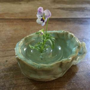ギボウシと、繁殖していた紫の花を自作の器に生けてみました。