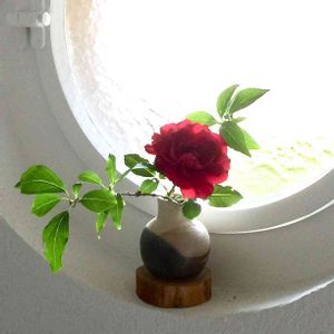 陶芸家の友人から頂いた器に、薔薇とレンギョウを生けました。