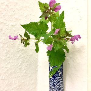 いただいた小さな壁にかけるタイプの花器に庭の雑草ヒメオドリコソウを生けてみました。