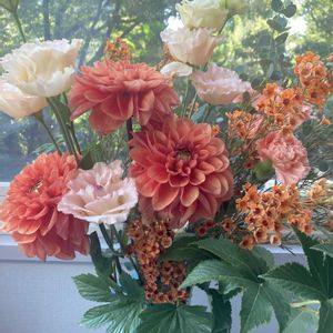 生協のお店の前に来られる移動のお花屋さんで見つけたこのダリア ピーチピンク🍑〜黄色💛のグラデーションがとっても可愛い💕 ダリアは花形や花色が豊富 メキシコ原産のキク科の植物で和名は テンジクボタン 品種が限定出来なくて 『こころ』ほど大輪でもなく『ピュア』にも似てるような 『プチガーデンダリア スマイルピーチ』にも見えたり… ダリアの花言葉 優雅 気品 華麗 威厳 うつり気 ワックスフラワー ダンシングクィーン フトモモ科カメラウキウム属 オーストラリア原産のお花 花びらがロウを塗ったように見えることからこの名がつきました レモン🍋のような香りがするのだとか… 花言葉 気まぐれ 可愛らしさ 繊細 ルリマツリ お友達のお庭に咲いていたので撮らせてもらいました🤗 シソマツ科 その名の通り 瑠璃色のお花が茉莉花(ジャスミン)に似てることから この名が付けられました 別名 プルンバゴ 花言葉 いつも明るい ひそかな情熱 同情 アベリア(白斑)は スーパーの花壇に咲いていました スイカズラ科ツクバネウツギ属 緑色の葉🌿に 白やクリーム色の斑か入った常緑低木 初夏〜秋にかけて香りの良い白いお花を咲かせます 花言葉 謙虚 謙譲 強運 気品 親愛 カランコエ クィーンローズ(ローザンヌ) ハロウィンの南瓜のような黄色💛✕オレンジ色🧡のバイカラーの八重咲き品種のカランコエ 花言葉 幸福を告げる あなたを守る 朗らかな心 たくさんの小さな思い出