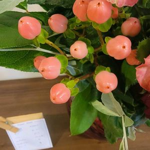 🏷️今日のお花 ヒペリカム おはようございます👋😃 撮影🤳9月12日 お出かけ先の生け花 ヒペリカム🧡 バラ🩷 マム🤍💜 ワックスフラワー🤍 いつも素敵なお花が飾られてます キレイ(*´˘`*)♡.。.:*♡ •*¨*•.¸¸☆*・゚