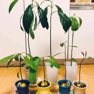 アボカド🥑ファミリー😊 それぞれ個性的です^ ^ 茎の色や葉の大きさも違って🌱 1号ちゃんは一度お外に出したら 葉が枯れてしまって💦 ただ今復活中です😅 この他にも根っこ待ち^ ^が5個 います(笑)