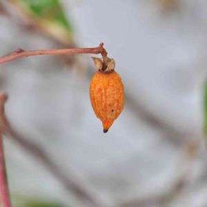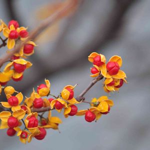 実が色づいてます。秋に黄色に熟すと3つに裂け中から真っ赤な種子が現れてます。