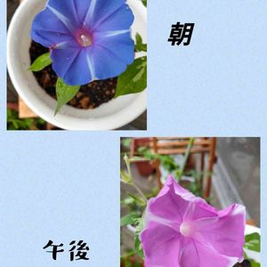 今日、初めてです😄 アサガオが午前と午後で、色が変わっていました😆 いつもは、午後にはしぼんでいたのに、今日は涼しく曇っていたからかなぁ…? ちょっとしおれているけど、色が変化してる姿を見られて、なんか嬉しい😆😆😆😆😆