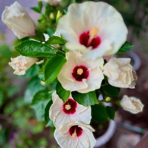 1️⃣ ハイビスカス Newロングライフシリーズ “アドニスホワイト”🌺 先日園芸市でお迎えしたお花が咲きました🤍 初めに置いた玄関フードが45℃越えになり出窓に避難しましたが時遅し…蕾は4個も落ちこの子も疲労の跡がしっかりと…🙇💦 (*_ _)人ゴメンナサイ 2️⃣ ムスクマロウ🤍 (ジャコウアオイ) 友達の玄関横に清楚なお花が咲いてます😌👏👏 昨年気づいたら庭に3か所も咲いていて、なんだか分からないけど可愛いから鉢上げして玄関横に置いたそうです😊👍 調べるとムスクマロウ 涼しげですʚ❀.ೃ✿.ೃ❀ɞ 3️⃣ バジル🌿 もういっぱい食べたし、ドライも冷凍も十分だから蕾取りを止めました😂 お花が可愛いんですよね~✨