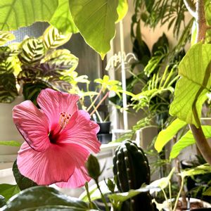 今日のハイビスカス🌺ロングライフシリーズアドニス😊かわいい🩷です〜😊葉っぱは寒さで黄色くなり始めてますが、まだまだ元気に咲いてくれてます😊インドアハイビスカスサニーシティーも赤いつぼみが膨らんできました😊