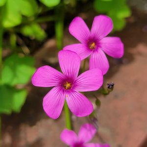 6月16日 今日のお花『カタバミ』です。 【イモカタバミ(芋片喰)】 南アメリカ原産、カタバミ科多年草 観賞用に輸入され野生化した。 花茎の先に十数個の花が散形につく。 花は直径1.5~1.8㎝で、花弁は5枚。 花の色は濃いピンク色で、濃い紅色の筋が入る。 花の真ん中も濃い紅色をしている。 雄しべの葯の色は黄色い。 よく似たムラサキカタバミは、雄しべの葯が白色、花色は薄いピンク色、花弁の基部がやや黄色を帯びる。 草丈:10~30㎝ 花期:4~9月 花色:ピンク 白野江植物公園@北九州市