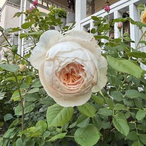 イングリッシュローズ、ヘリテージの枝がわりであるローズマリーです。13年目。 春から秋、庭からベランダにあげてみました。 やはり花数、シュートの出に歴然の差がありました。 でも秋の花、大変美しく咲いております。一輪で咲いているので大きくてこれは満足。