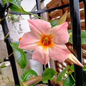 ベランダのサンパラソル⛱️、競い合うようにツルが伸びて咲き進んでいます💕。