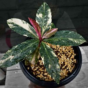 万両斑入り 今日、直売所に買い物にいって、きれいな斑入りの万両があったので買ってきました☺️ 芽が赤いし、本斑なので西王母という品種だと思います😃 今はほとんど見ること出来ない品種です😁