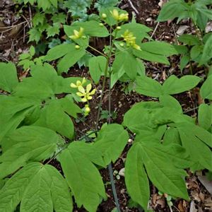ホソバヤマブキソウ 久しぶりに友達と山に行きました☺️ 鹿の食害がひどく、ほとんどの下草は食べられていましたが、この子はトリカブトに紛れて難を逃れたようです😅