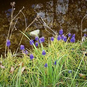 小川のほとりにムスカリの花が沢山咲いていました🐤 黄色や白の花が多い日本の春にすごく目立つお花です☺️