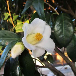 シロヤブツバキ いつもよくお伺いするお宅に白のヤブツバキが咲いていました😆 愛媛県を代表する白花、篤山椿かな😁 でも少し早すぎる気も