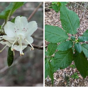 バイカツツジ ツツジ科 初めての出会いです♡ 名前の由来は、白い小さな花を梅に見立てたもの。バイカツツジの花は葉に隠れるようにまばらに咲き、上側の花びらの基部には赤い斑点があります。 直径2cmくらいの小さなお花、しかも葉の下に隠れるように咲いているので目立ちません。 でもよく見るとまばらにポツンポツンとてもかわいいお花をいくつも咲かせていました♡