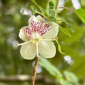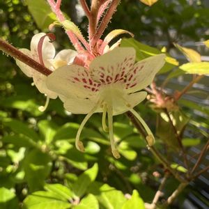 見たかったバイカツツジが数個だけ残ってました❣️初めましてです。葉っぱの下に花径2㎝ほど小さな花がつきます。紅色の斑点がチャームポイント。この斑点のつき方は東日本と西日本と異なるそうです驚。 メモ📝 ▪️斑点は東日本では上3枚の花弁につくが、西日本では蕊を取り囲むようにつく。 ▪️5本の雄蕊のうち、上の短い2本は仮雄蕊と呼ばれるもので受粉能力がない 7/13栃木県