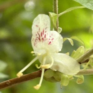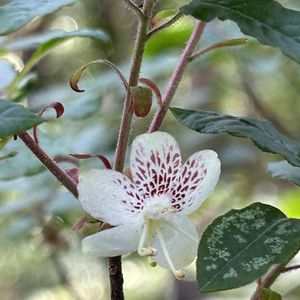 近くの低山で。 葉の下に白い物が見えたので覗いてみると、 白地に紅色の斑点がある 可愛いお花がありました🎵 下を向いて目立たずに咲いていました。 「バイカツツジ」 この時期でもツツジの仲間が咲いているのですね🤩