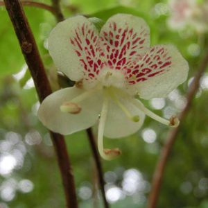 バイカツツジ(梅花躑躅) 径2cmほどのキラキラ✨輝く白色の花弁の上面に薄紫色の斑点模様✨そして5本ある雄蕊のうち、下3本は長く上2本は短いのですね✨ 黄緑色に見えるのが雌蕊です。 (⬆️の写真でハッキリ見えます) 昨年この辺りで見たような🤔と探しながらの山歩き🚶♀️ 行きでは見つからず帰り道、何かわからない可愛い果実を見つけて写していたら… あれ?あれ?隣の葉陰に1輪❀︎数輪❀︎❀︎俯きがちに咲くバイカツツジをやっと見つけました♬ ⬆️は枝先を持ち上げての撮影です😁 今思うに、あの果実はもしかしてバイカツツジの果実⁉️ また行ってみよう😊見つかるかなぁ〜